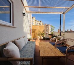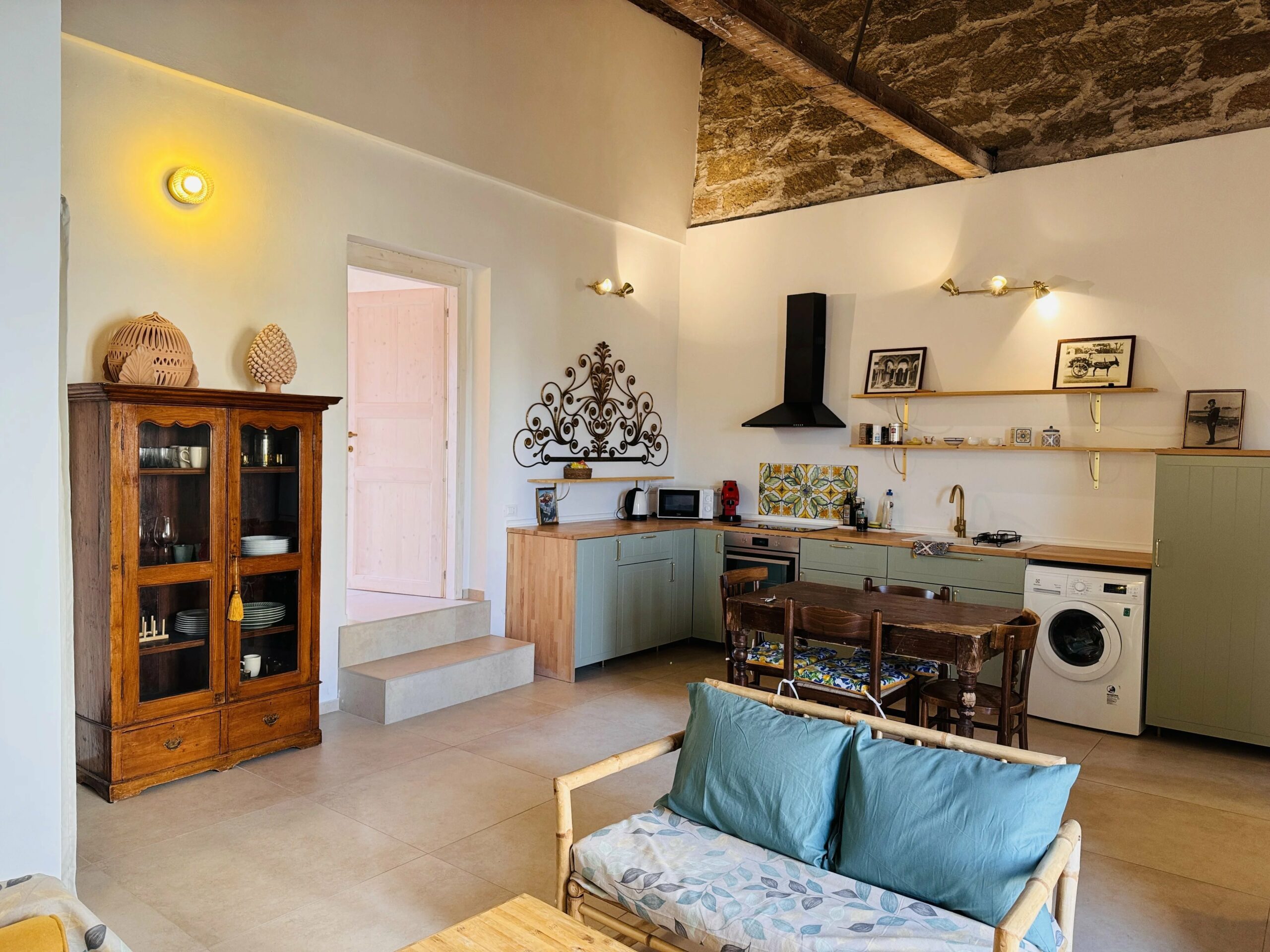 The 25m² living room is where Casa Andrea's character really emerges. The high vaulted ceiling with exposed wooden beams creates dramatic height, showing original stonework at the apex while at eye level the finishes are modern and gleaming. It's an ideal balance between traditional Sicilian architecture and contemporary living. The space accommodates a handsome dining table and well-equipped modern kitchen, with large windows bringing generous daylight. It opens directly onto the 15m² terrace, currently furnished with outdoor dining furniture and partially shaded by a gazebo. This private outdoor space is a genuine luxury for a Palermo apartment, and will be a boon to you and your guests practically all year round.