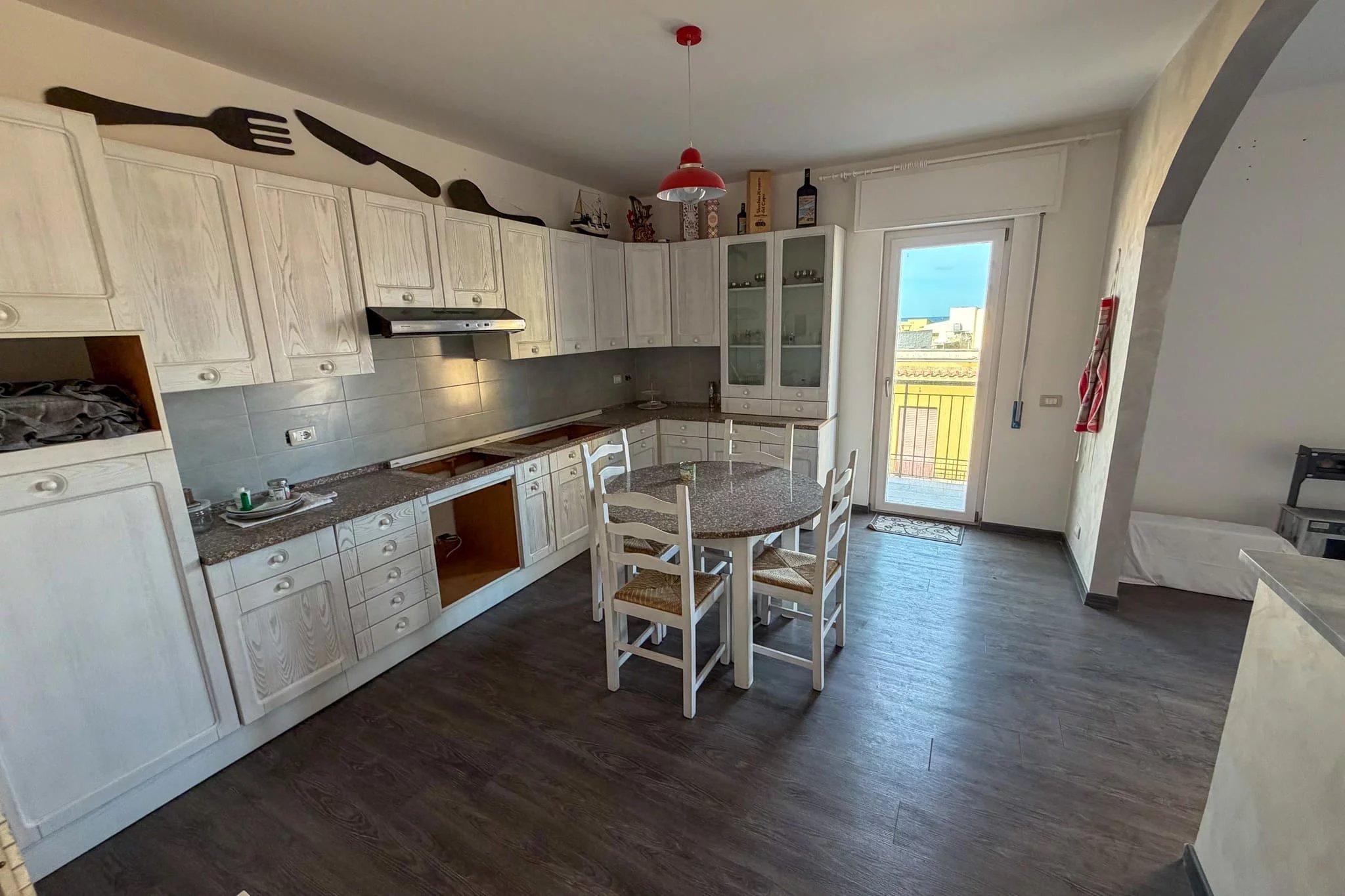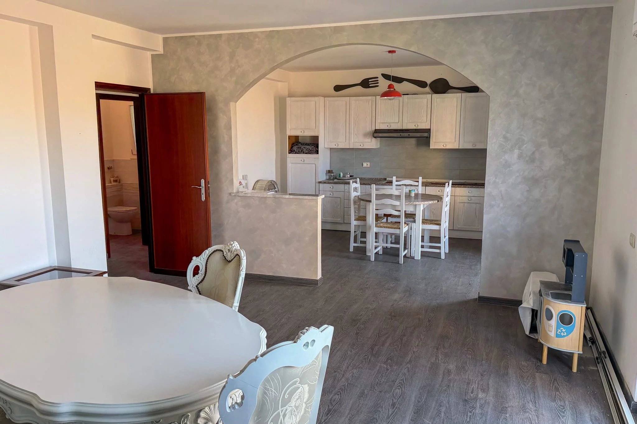 Once inside, you pass briefly through an entrance hallway and find the standout feature of the apartment on your right: the combined living and dining space. The salone, measuring 27m², is flooded with natural light from French windows and an additional window, both facing north towards the sea. Through a broad archway this connects seamlessly to an 18m² kitchen, creating a modern, open-plan living area that spans the entire width of the apartment. The kitchen has its own door onto the balcony, and you could squeeze a small breakfast table in out there if you wanted.