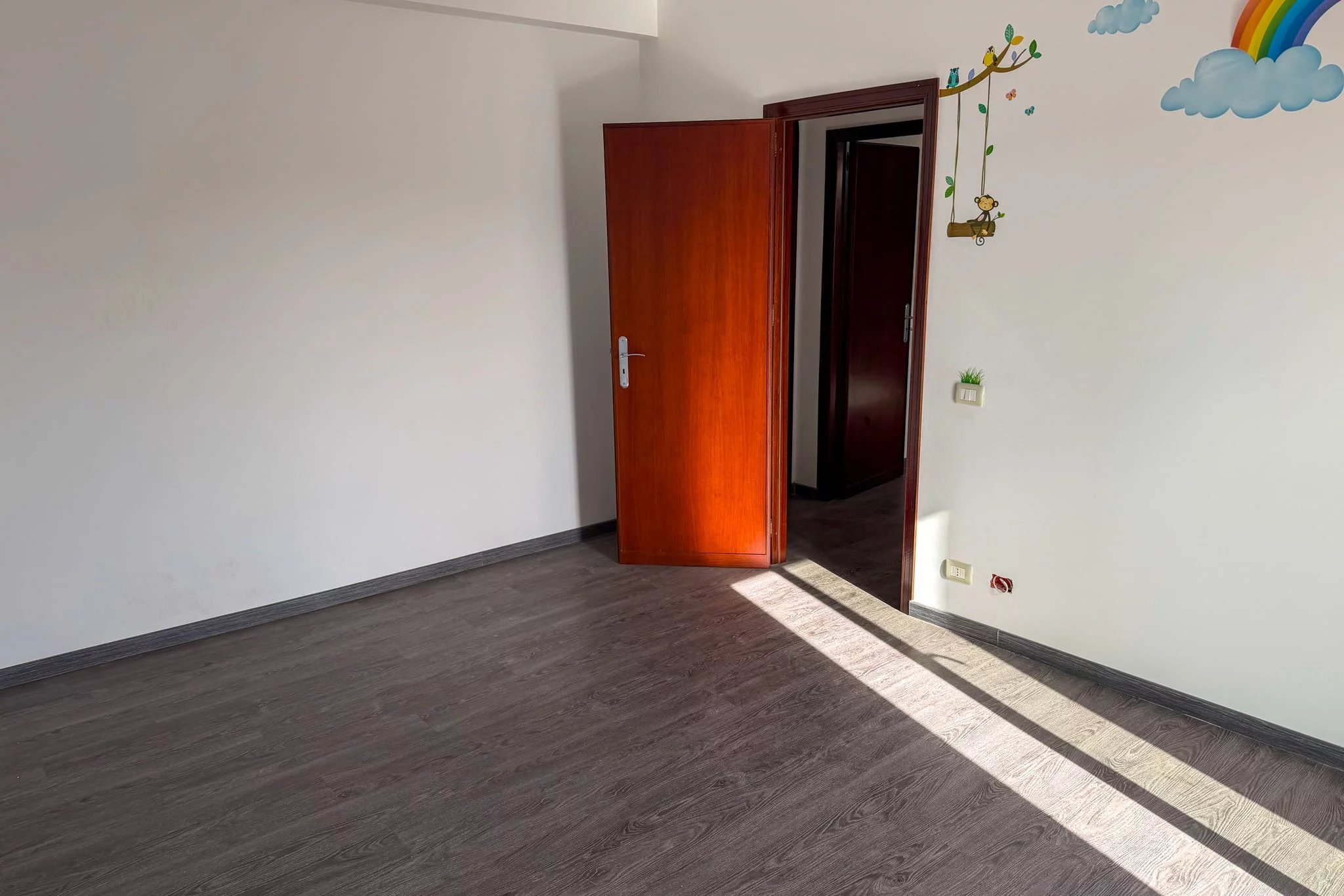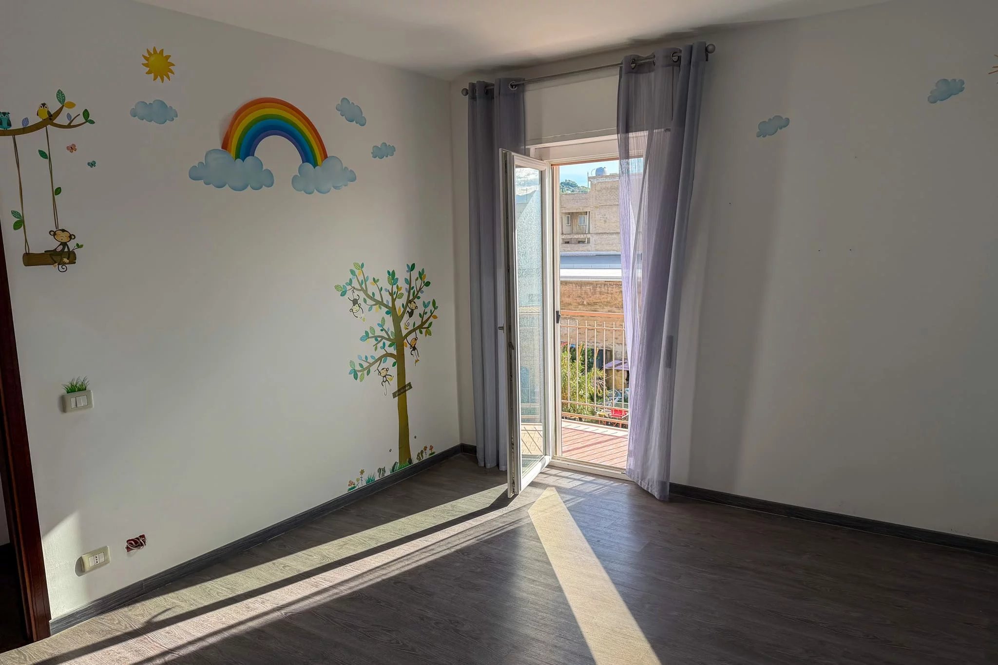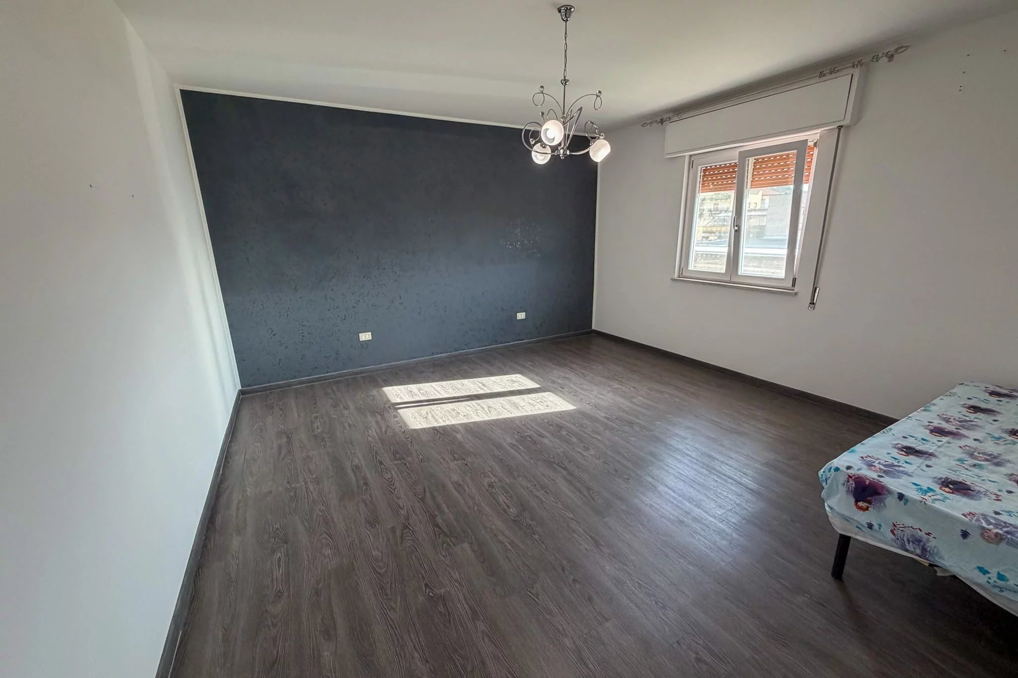 Both bedrooms are genuinely spacious. The larger one measures 21m², while the slightly smaller one offers 17m². Each has been decorated with a feature wall in a shade of blue, and the smaller bedroom has a glazed door opening onto the south-facing balcony. This balcony, which runs along the back of the property, offers excellent views across to Monte Catalfano to the east. It's wide enough for outdoor dining and catches beautiful afternoon and evening light.