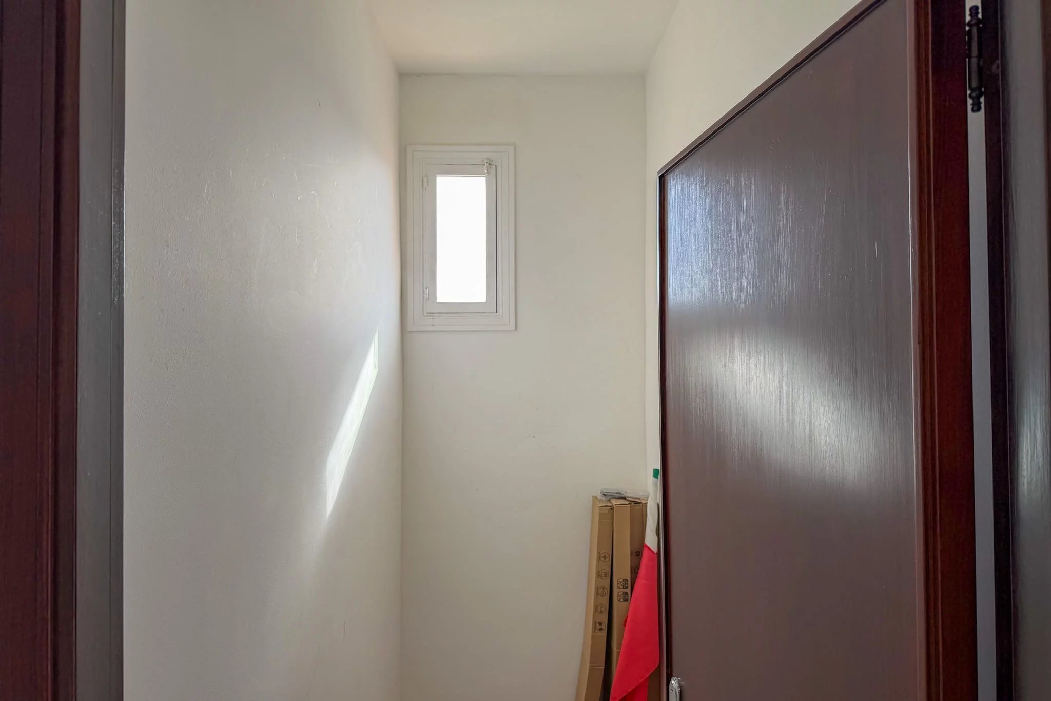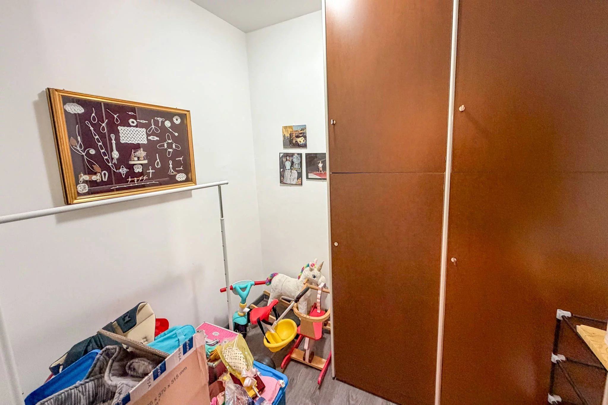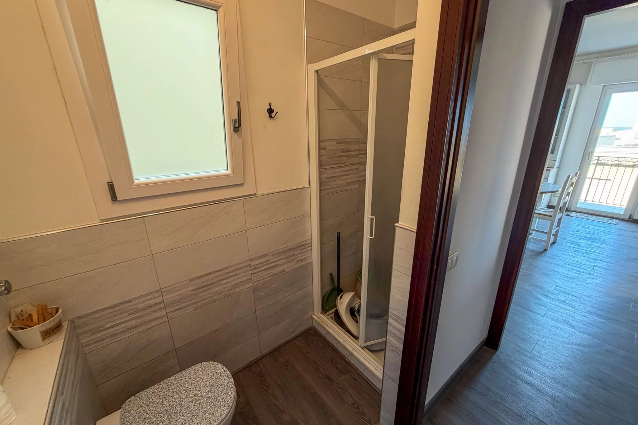 The bathroom is spacious and fully tiled in a natural shade, with a bathtub fitted with shower attachment and curtain. There's also an additional WC just across the corridor from the kitchen. Two storerooms provide ample space for keeping everything organised, particularly useful if you do plan to rent out the apartment, keeping personal belongings secure while giving guests access to cleaning supplies and so forth.