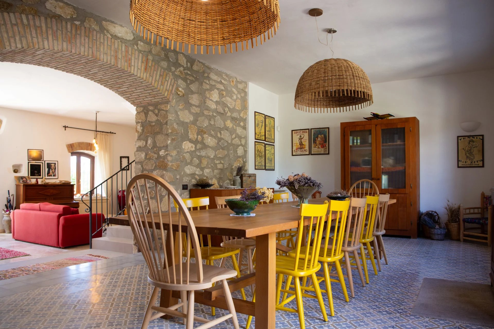 The imposing double-width entrance of the main building leads you into a magical living room, over 30m2 in size. Historic masonry and brickwork is showcased on the feature wall and above the arch top windows, and the rest of the finishings are simple in fine grain plaster and large polished floor tiles.