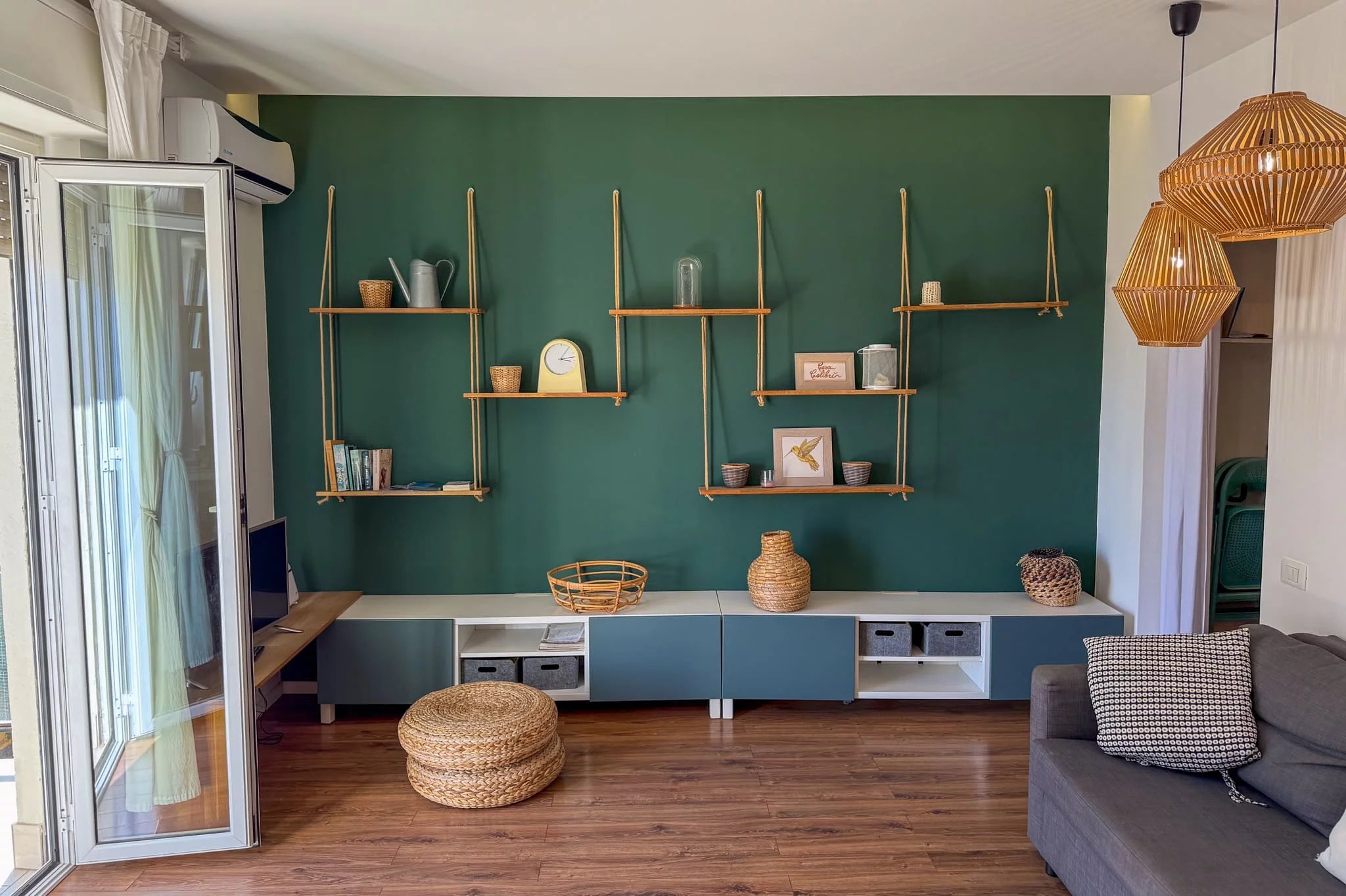 Inside, the flat has a simple, highly functional layout. You enter into an open-plan living area that seamlessly combines the fully equipped kitchen immediately to your left with a sitting room further ahead. The two are separated by a marble-topped breakfast island, a design which maximizes the sense of space while facilitating the social atmosphere of a holiday home. The lounge area is given a relaxing tone by a green feature wall, a colour scheme which is subtly echoed by the leaf prints on the kitchen tiles. An air conditioning unit opposite the sofa can keep you perfectly cool in summer.