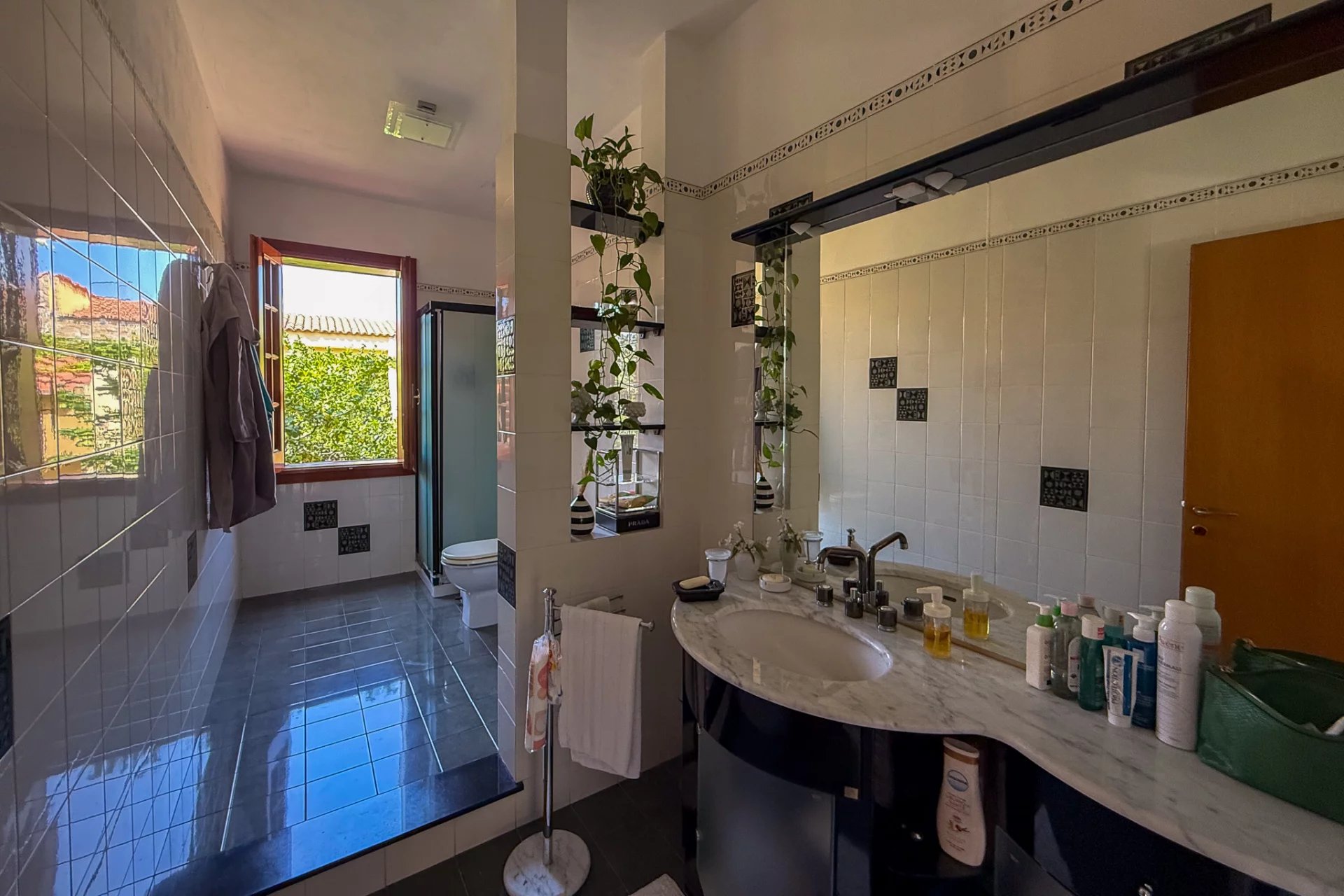 Casa d'Anna offers 228m2 of indoor space, divided almost exactly in half between its two floors. It boasts a beautiful exterior, a mix of rusticated sandy plaster and border work in handsome local stone. Balconies and an irregular sloping roof give a little extra character. The eastern elevation is particularly nice, characterised by garden-view French windows that open onto terrace and balconies along both the ground and first floors.