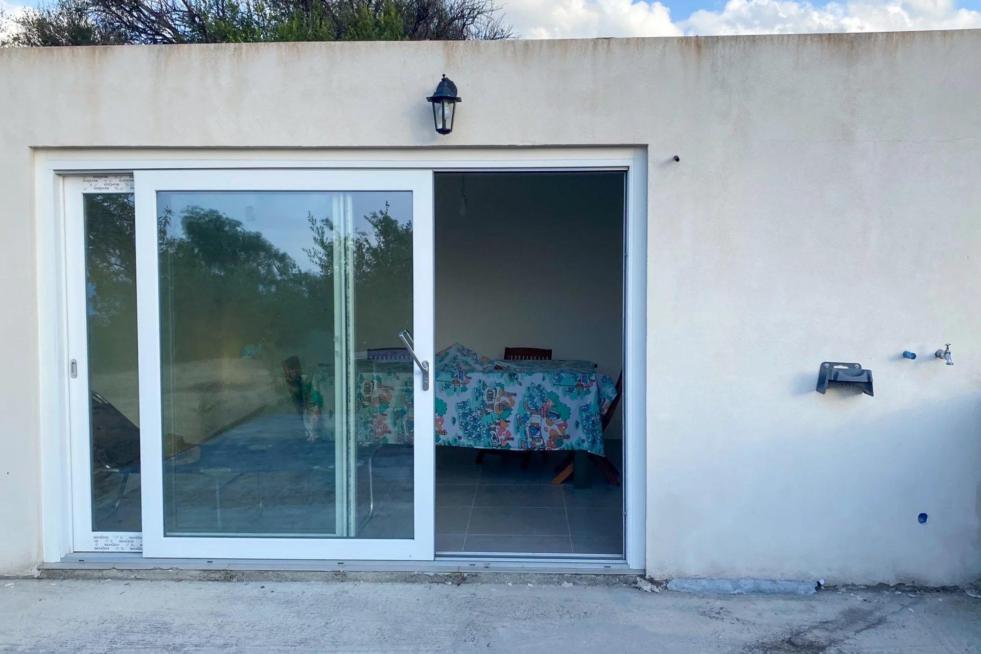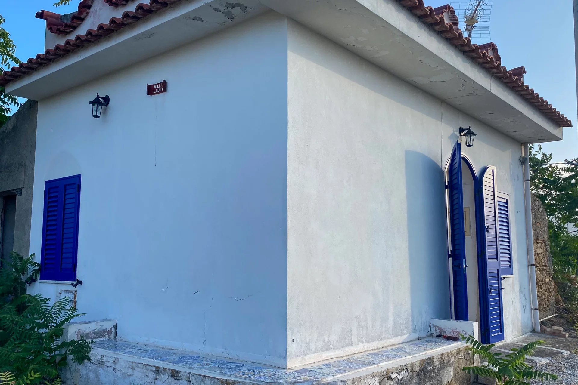 The first building contains a stone-built kitchen, just renovated and decorated in a colourful yellow and blue tile pattern. Around 20m2, this L-shaped structure has a decorative roof with curved tiles, distinctive blue shutters on the windows and doors, and a huge dining table that can seat up to ten people. There's also an external structure in wood, which will become a bathroom, and space for a bed if you need to fit one in there.