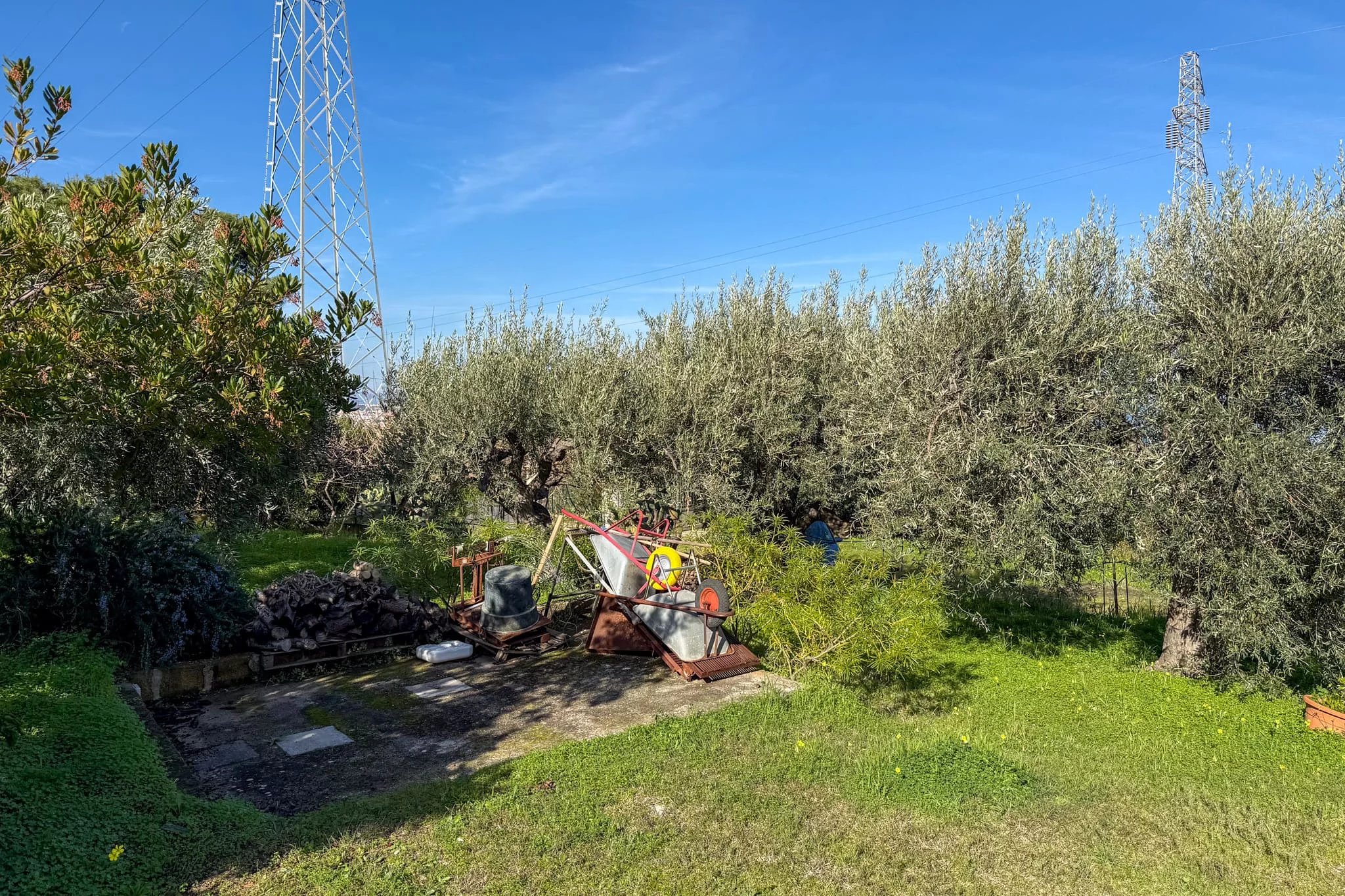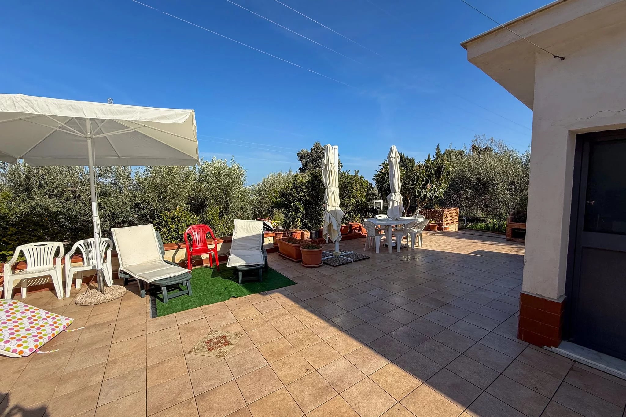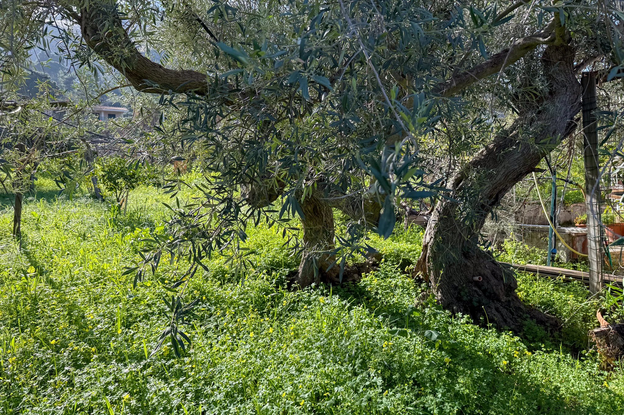 The approach to Casa Vaccaro sets the tone. A driveway gate – currently manual but prepared for automation – opens onto a sprawling plot of 2,250m² planted with silver olive trees, lemons, oranges, mandarins, grapefruit, figs, pomegranates, loquats, apricots and almonds. This is beautiful garden space, a productive Mediterranean landscape, tended with evident care and which changes colour and scent with every season.