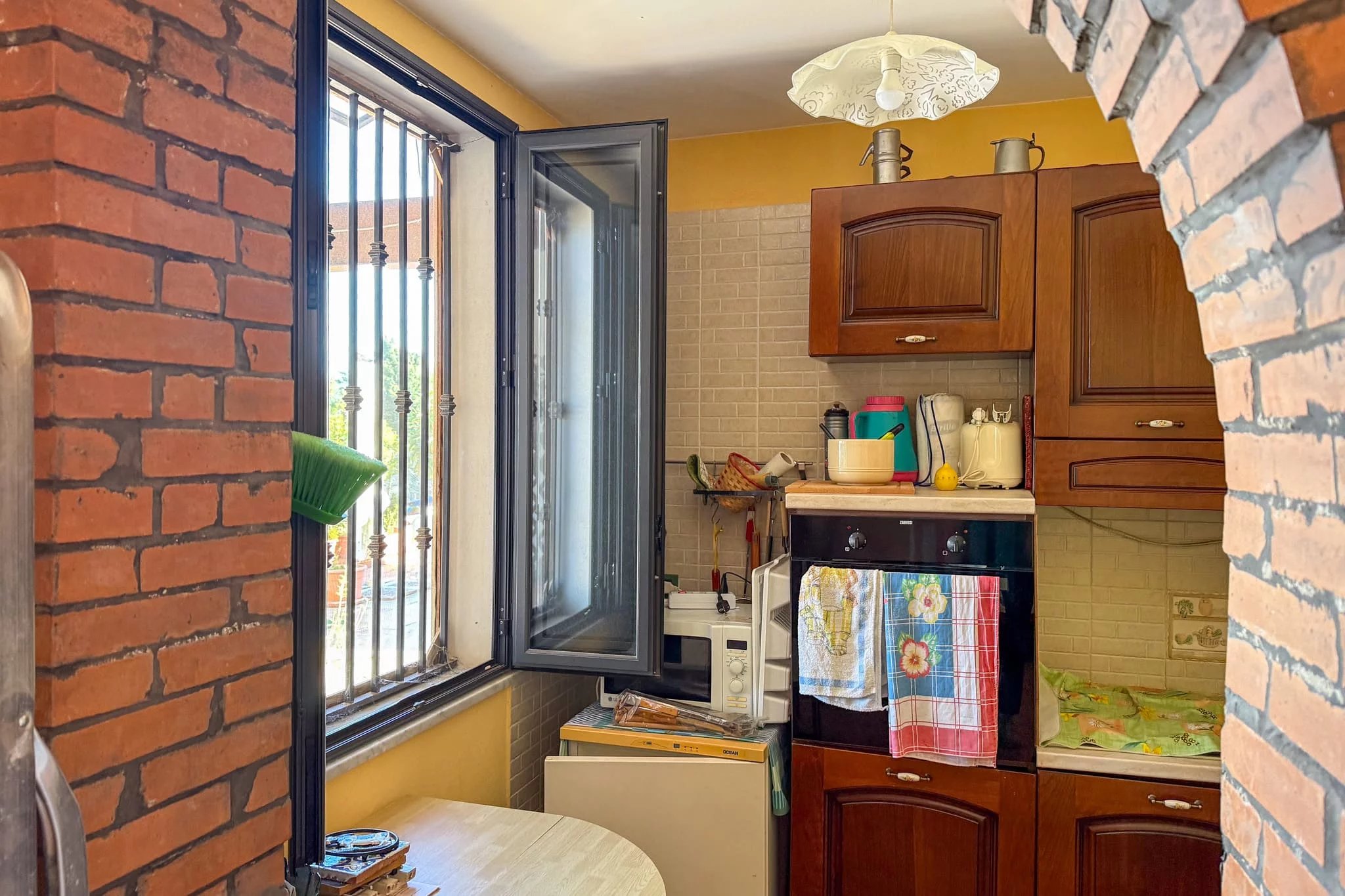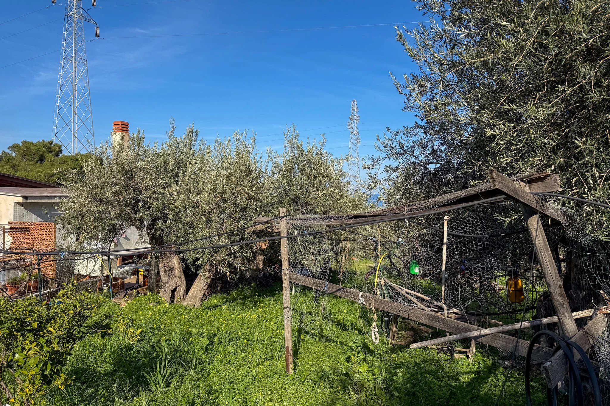 A paved terrace of around 100m² serves as the heart of the outdoor living space, shaded by a solid registered wooden canopy. From here you look out towards the sea on the horizon. A traditional wood-fired oven, currently in need of restoration, stands ready to become a centrepiece for al fresco entertaining. Beside the terrace is a 25m² outbuilding that already has water and a bathroom connection – a flexible space with clear potential as a guest annex or independent studio.