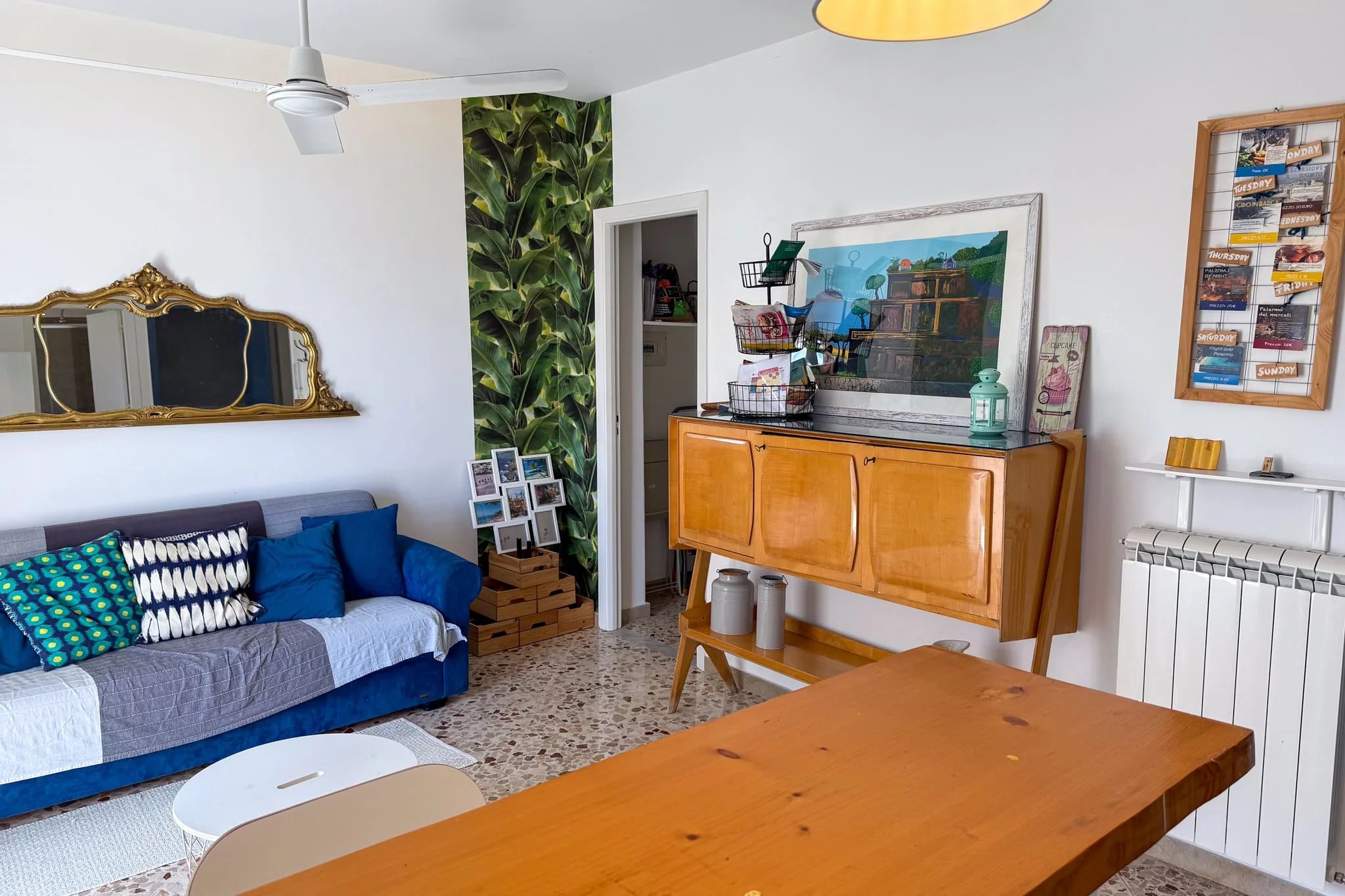 You reach Casa Brigitte on the second floor. The front door opens into an open-plan living space where kitchen and sitting room flow together around a wooden breakfast island. The kitchen is fully equipped and finished with a contemporary majolica backsplash. In the lounge area, a leaf print motif on the wall sets a warm, relaxed tone, and a ceiling fan keeps things comfortable in summer. French windows lead out to the balcony overlooking Corso Filangeri, where there is enough room for a small table and chairs – a fine spot for morning coffee or an evening aperitivo.