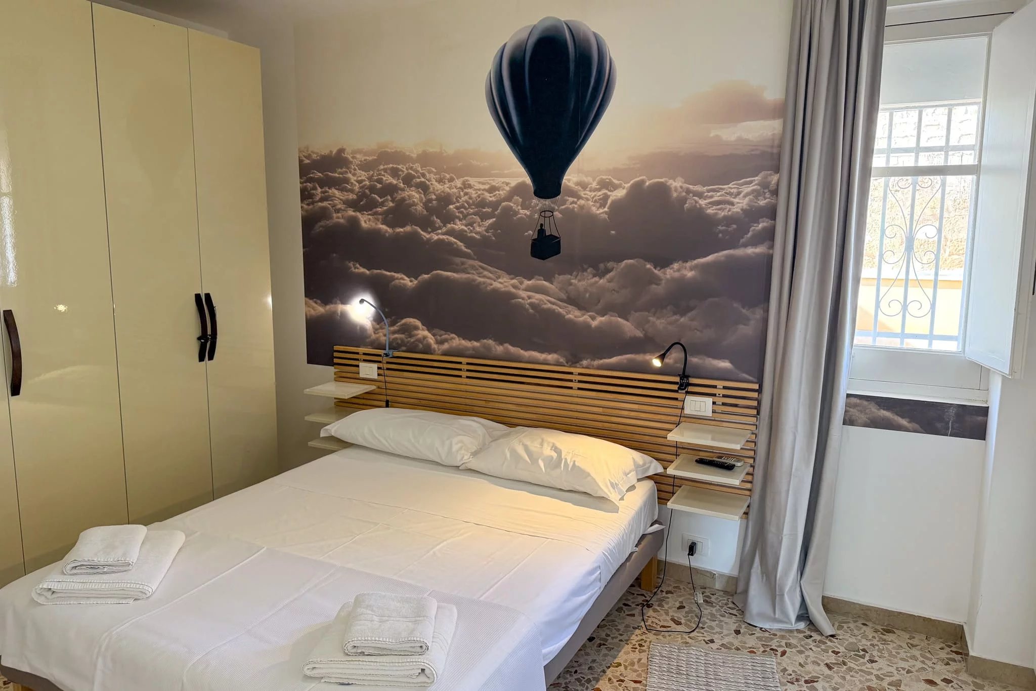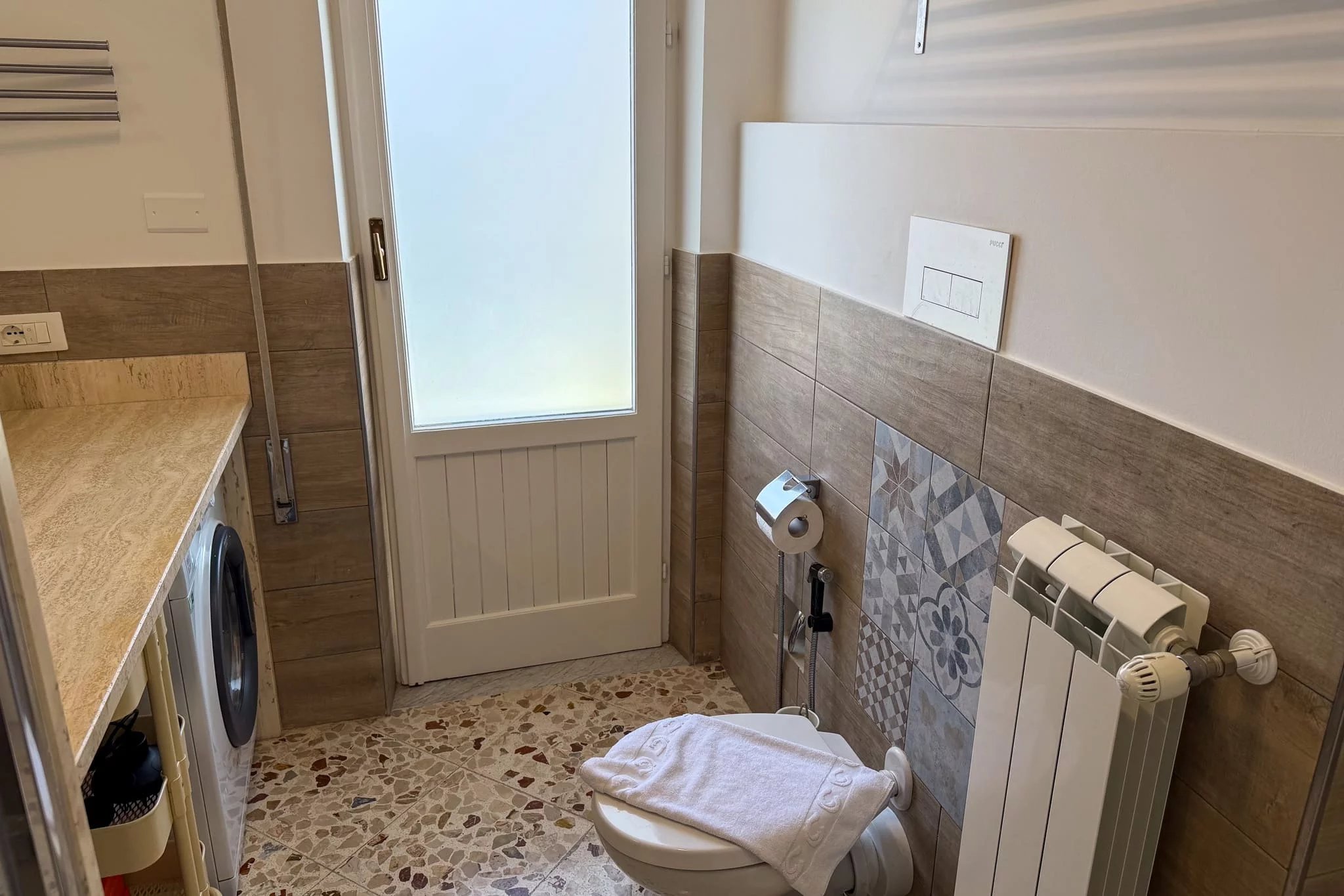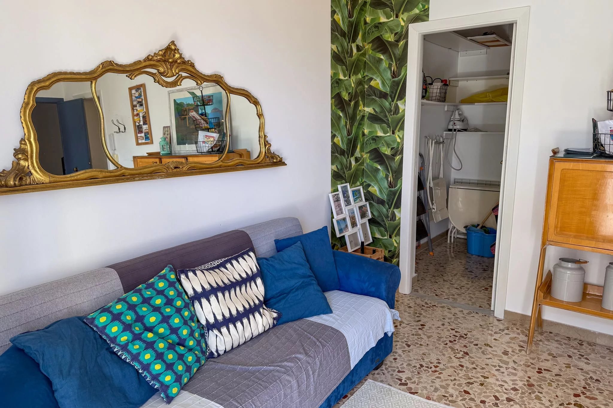 The renovation was thorough. The apartment was stripped back to its structural walls and entirely rebuilt, with new electrical wiring and plumbing throughout. Casa Brigitte retains beautifully restored original period windows, which add character while remaining fully functional. Autonomous gas heating with radiators and a boiler for hot water provides year-round comfort, and the southern orientation fills the rooms with natural light. Traditional Sicilian floor tiles run through the apartment, complementing the warm Mediterranean feel of this holiday home in Santa Flavia’s most central location.