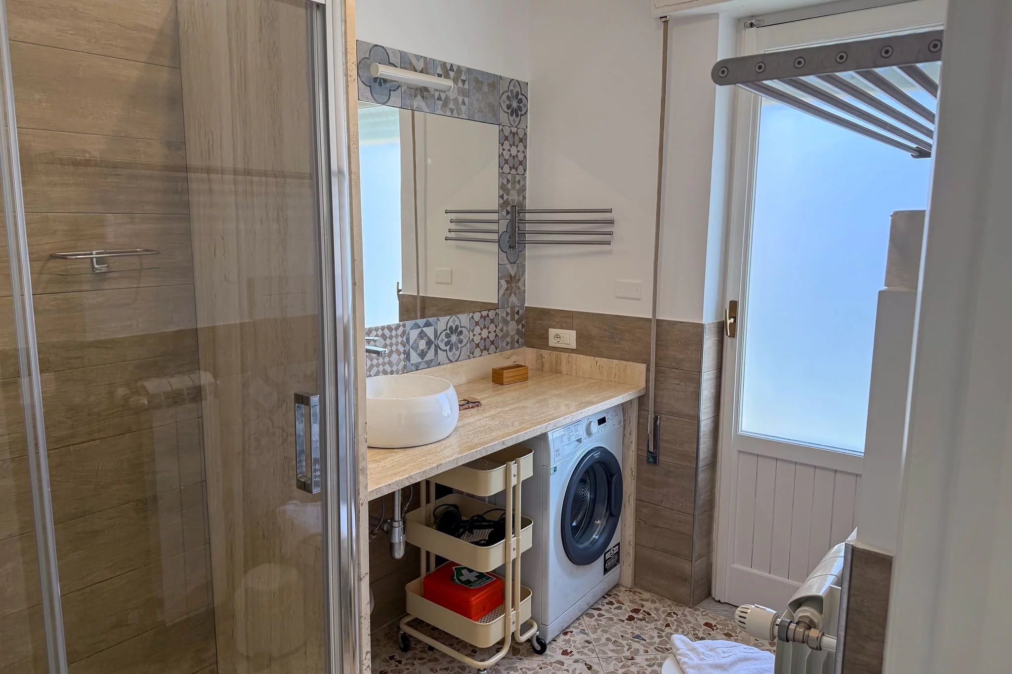 Off the kitchen, the bathroom has been finished to a good standard, with a box shower, the same majolica motif, a large mirror and a washing machine. A separate storeroom completes the flat.
