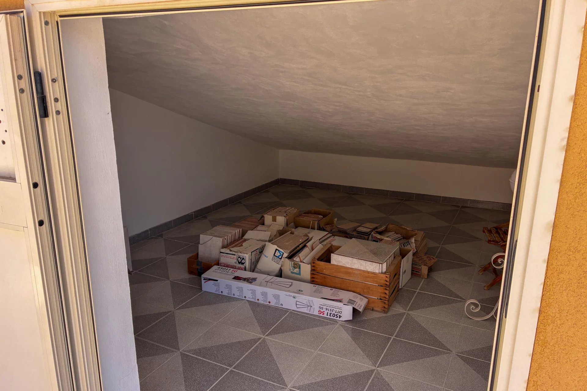 Outdoors, a section of the 1,300m2 plot which directly surrounds the villa is paved, keeping maintenance simple in the dry climate. It's enclosed by a concrete wall with iron railings, and some palm and pine trees. Beyond to the south is a small orchard with ploughed earth, where you'll find two pomegranate trees, six olives, a mulberry, three pears, a plum, six mixed citruses, ten grapevines and some prickly pears. On the north side, the main entrance has an automatic gate and there is plenty of space for off-street parking even without the garage in use.