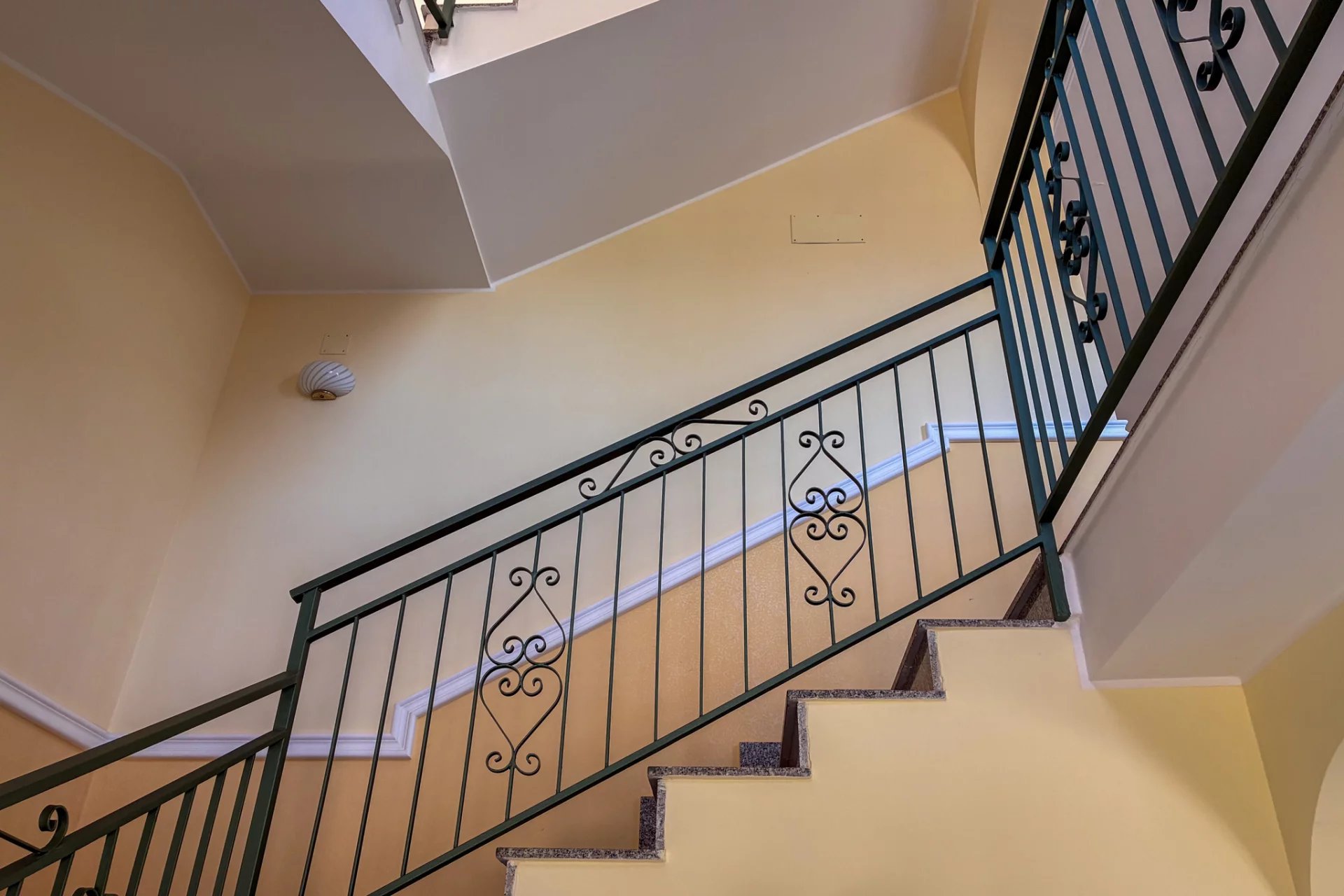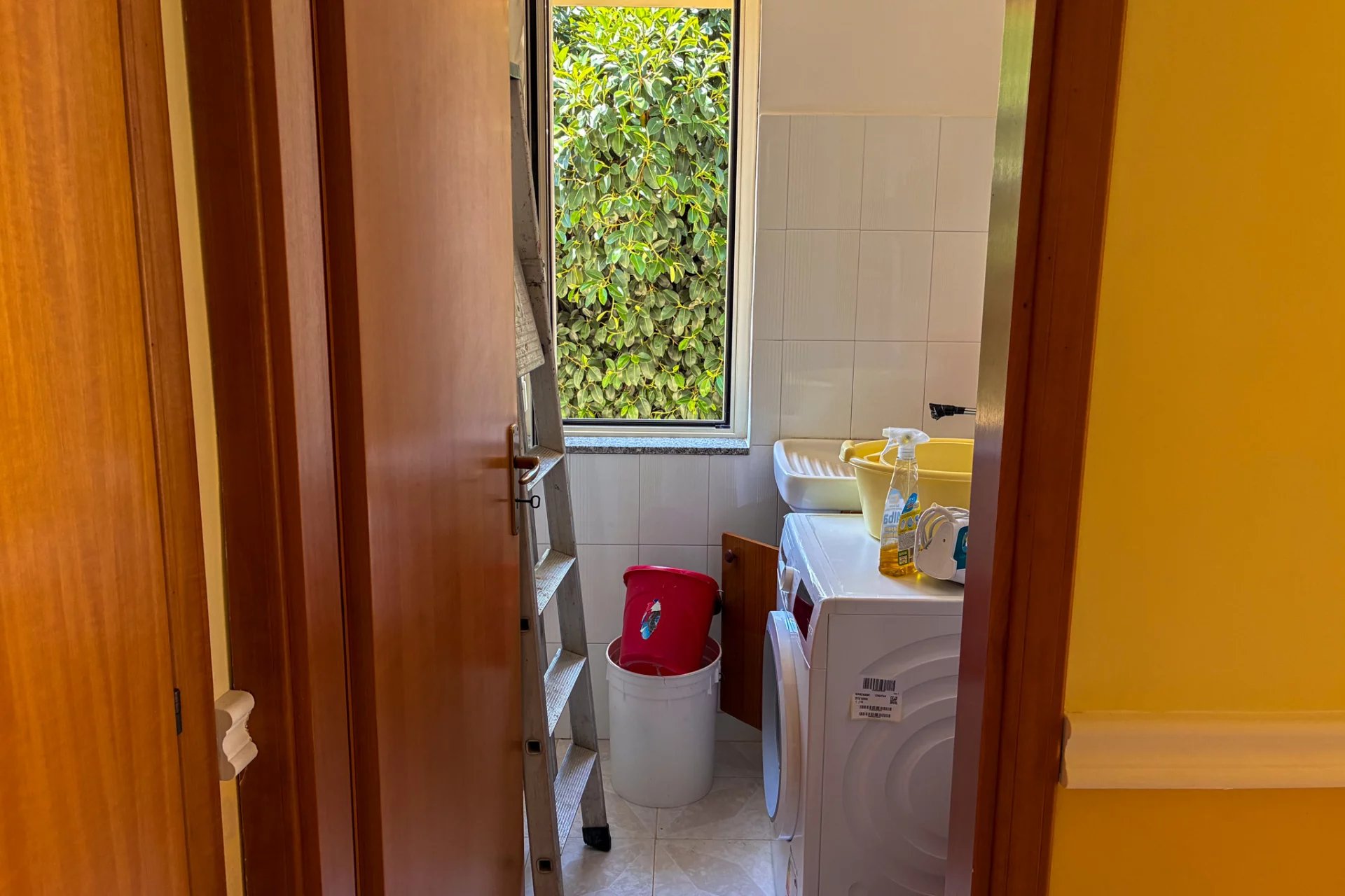 Back at the front of the property, the garage is currently used as an extra bedroom with a double bed, small wardrobe and a south-facing French window. The floor is completed by a washroom with a WC and a Laundry room, both in a white tile. The rest of the decoration is very unified, with soft yellow tones on the walls and easy-clean ceramic tiles underfoot. The staircase is in a dark marble which is used again in the windowsills.