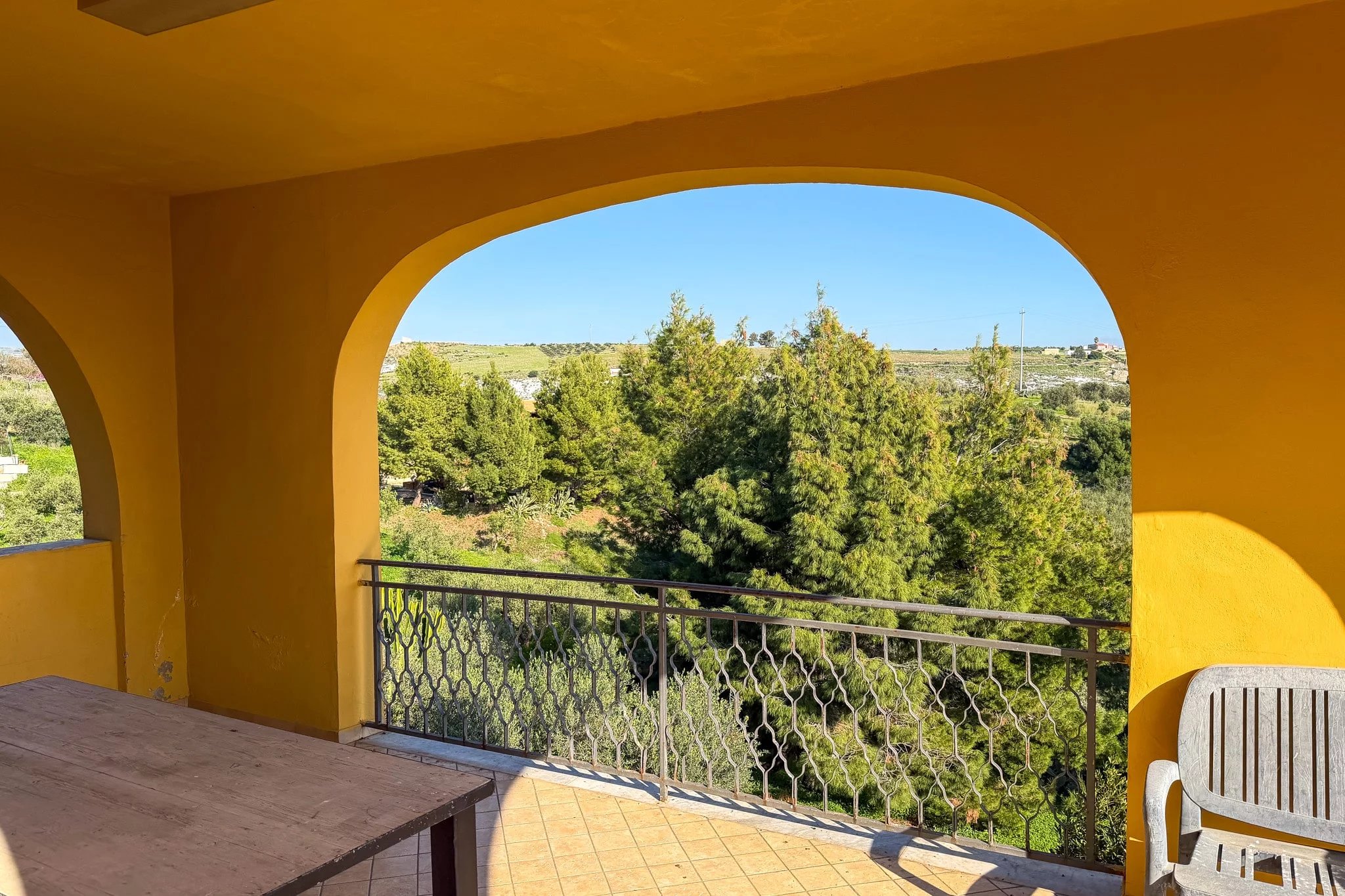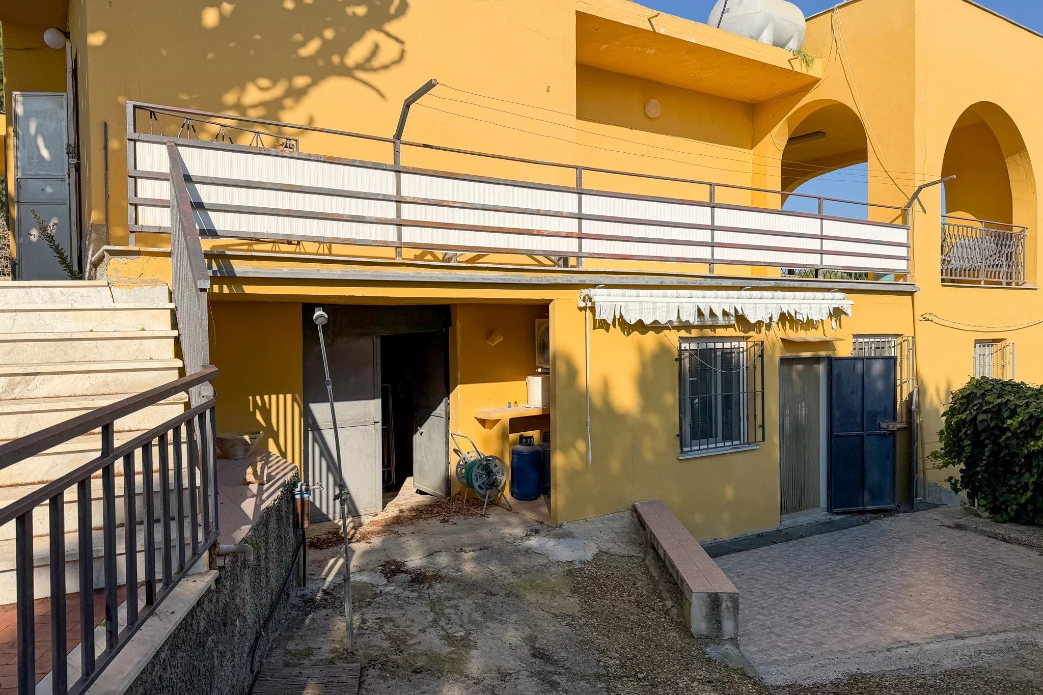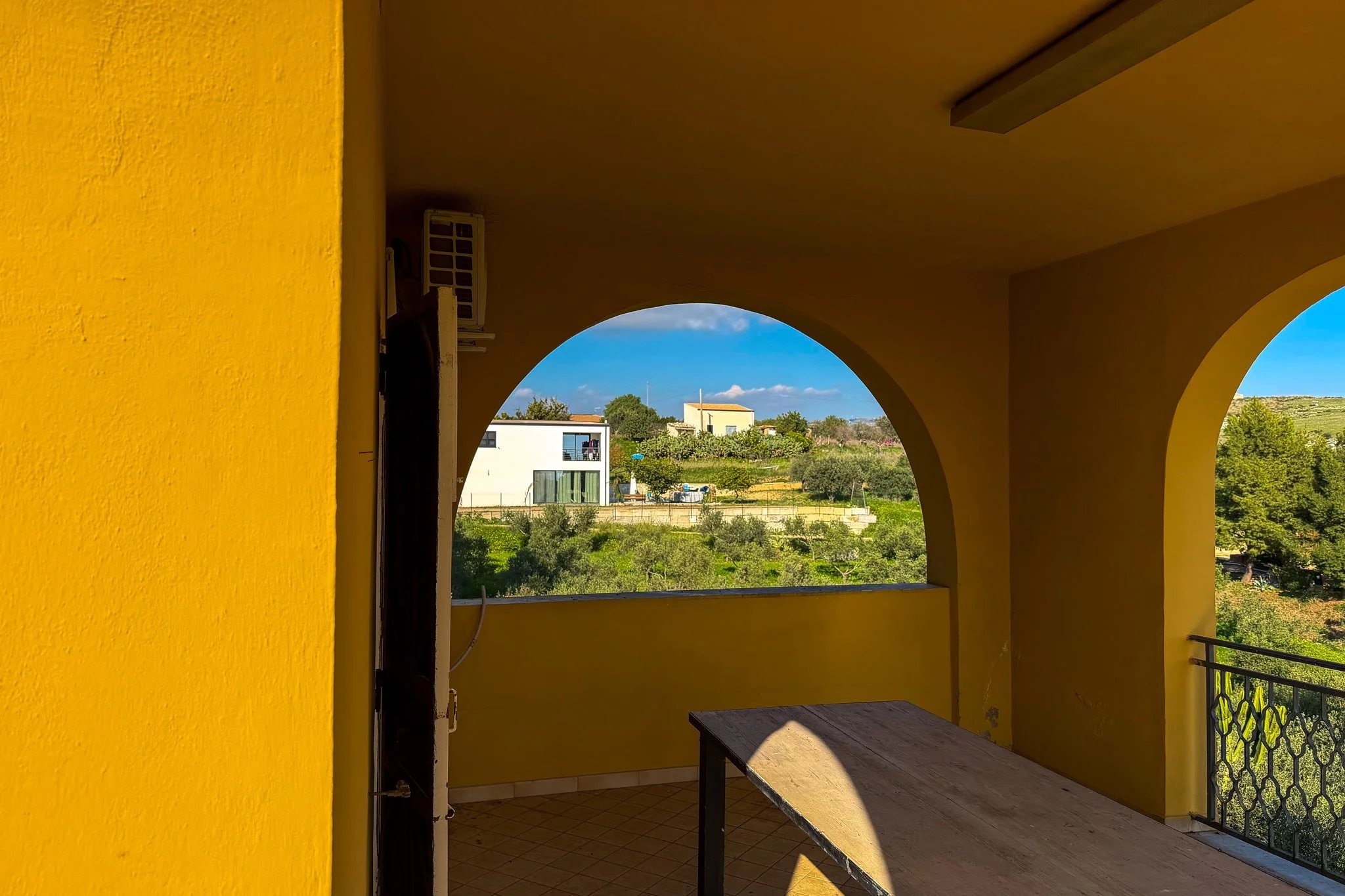 The villa is arranged over two storeys, with both apartments sharing the same traditional architectural style. Yellow plaster covers the exterior walls, and round arches frame the covered porticoes that wrap around parts of the building. These arched spaces are typical of Sicilian country houses and provide shaded outdoor living areas during the long summers.