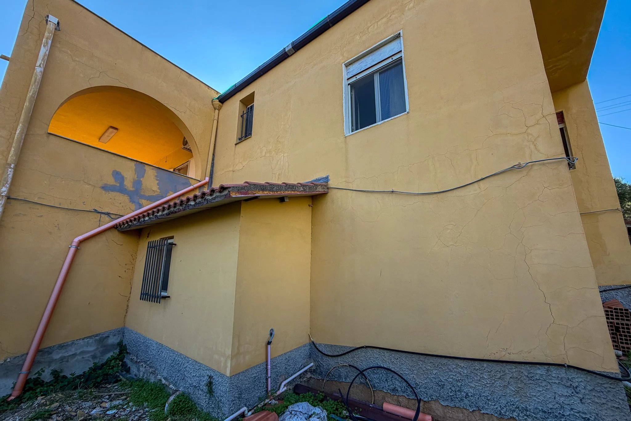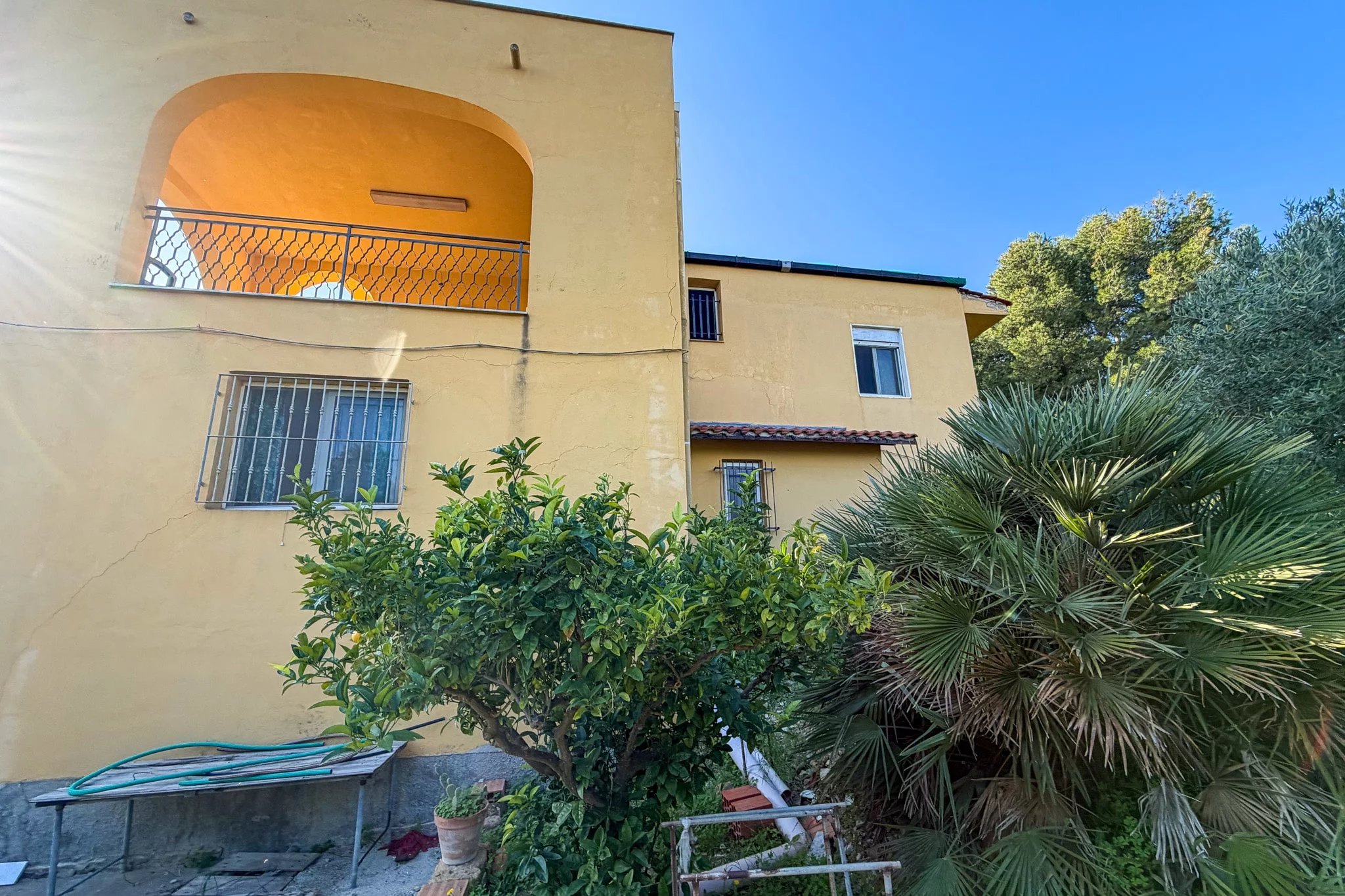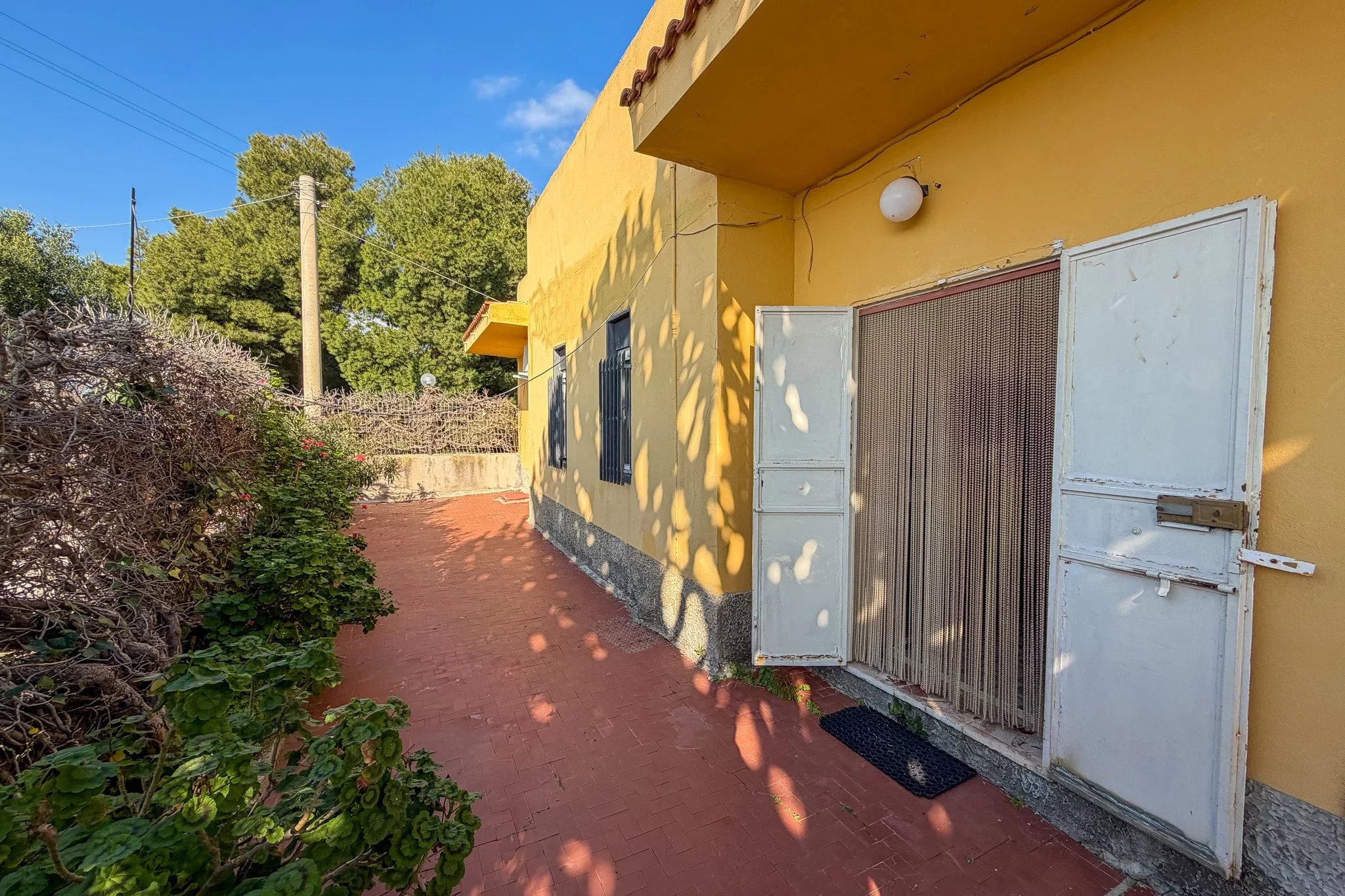The villa is arranged over two storeys, with both apartments sharing the same traditional architectural style. Yellow plaster covers the exterior walls, and round arches frame the covered porticoes that wrap around parts of the building. These arched spaces are typical of Sicilian country houses and provide shaded outdoor living areas during the long summers.