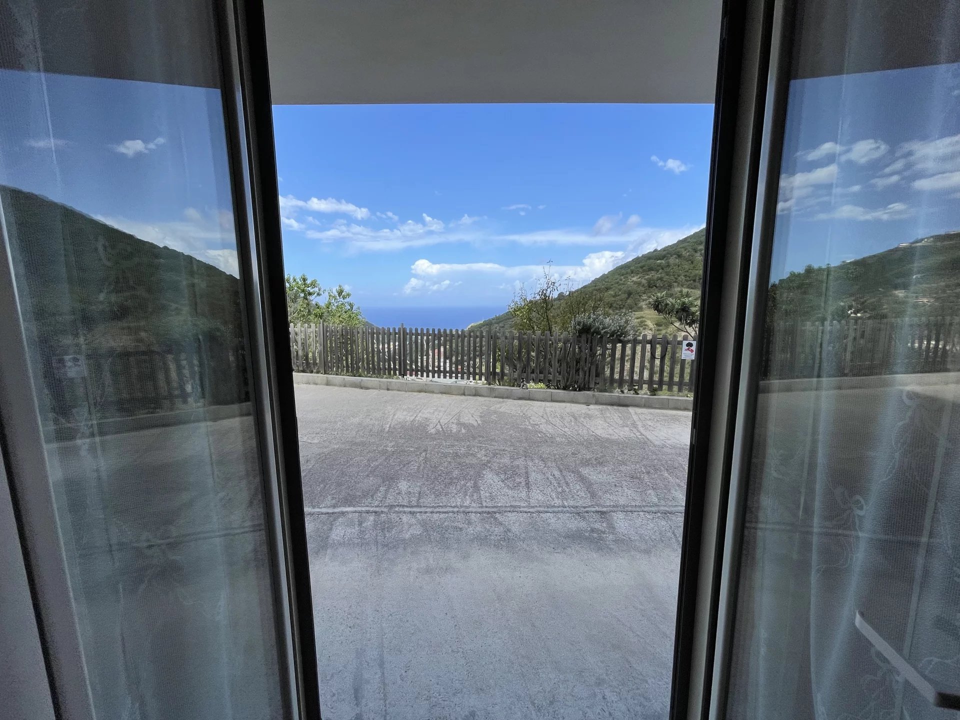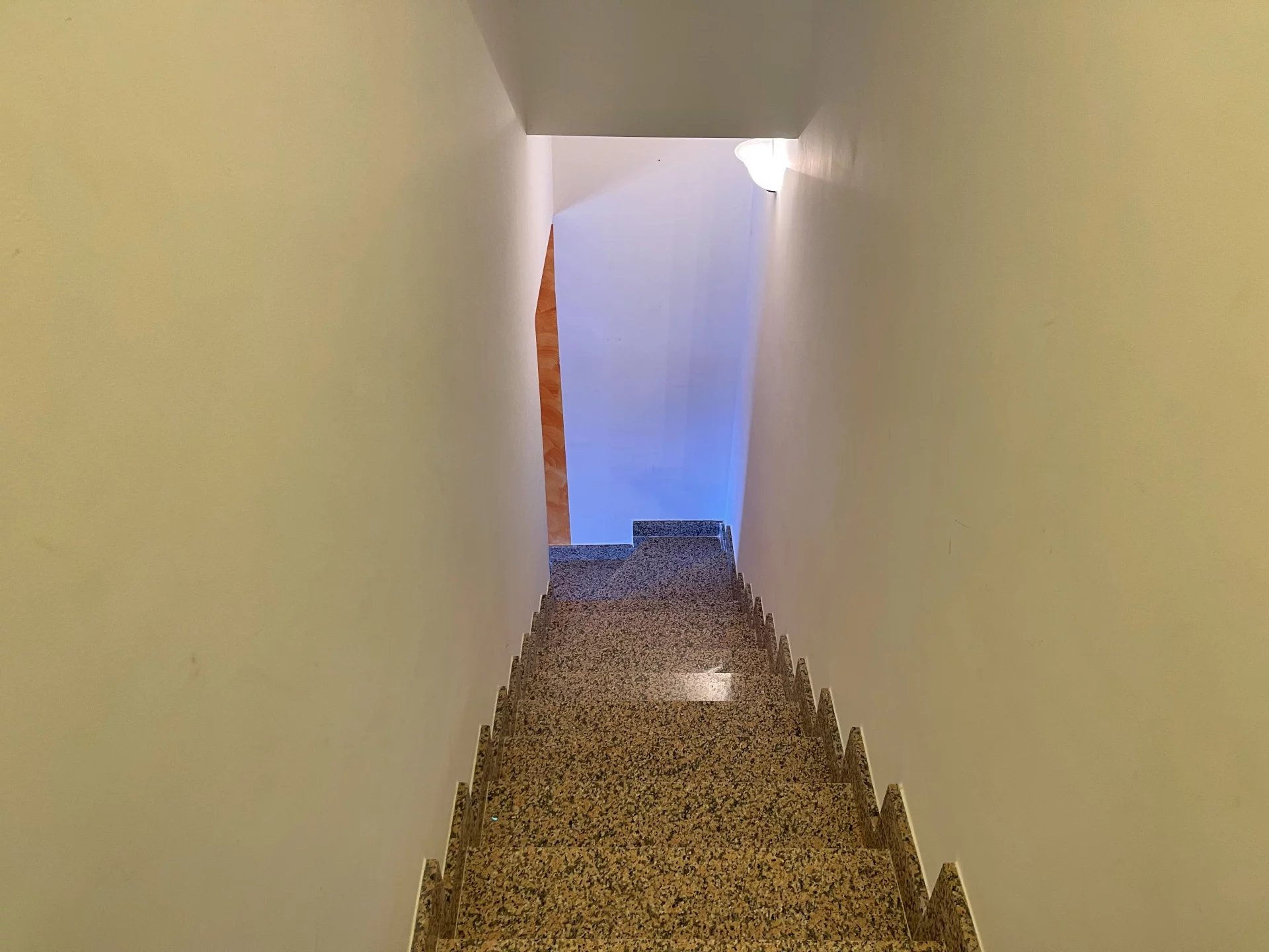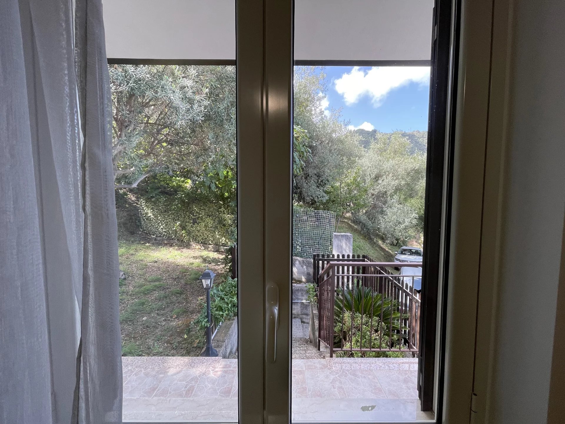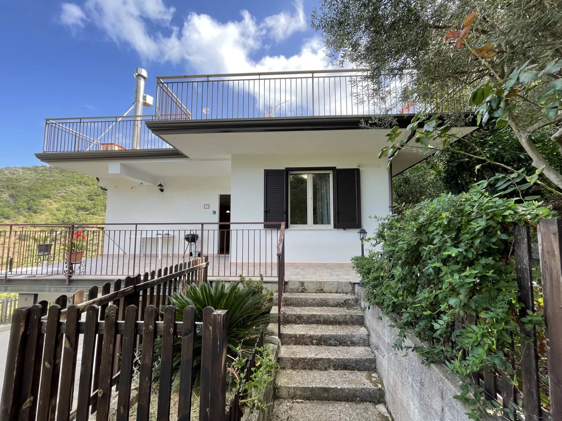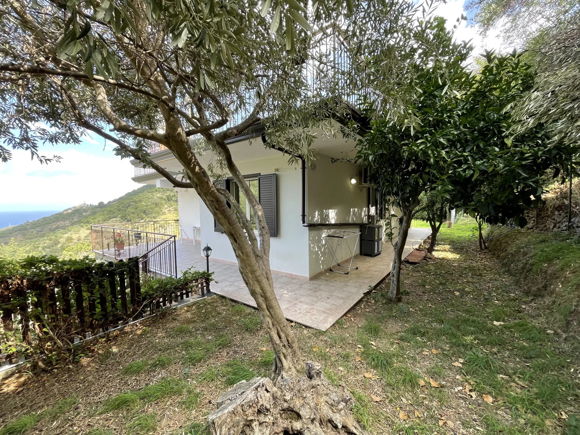 The villa is arranged on three levels and has two independent entrances. The larger apartment is upstairs on the first floor, reached by an external staircase that curves upwards in the shade of some leafy Mediterranean greenery. A terrace wraps around the building on both sides and to the rear.