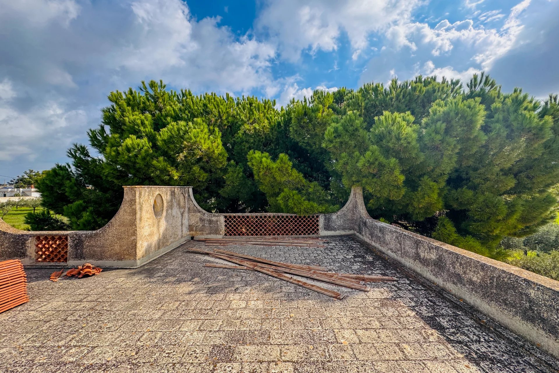 A short driveway leads you from the front gate, under a beautiful pair of twin pine trees, to the villa. This immediately shows itself to have a striking and individual design, with broad whitewashed stairs leading up to a concrete portico framed by huge Roman arches. Two wooden-framed verandas (currently uncovered) flank the building on the north and east sides, and an external staircase leads up to the flat roof terrace. Everything combines to create a very distinctive silhouette. It is a single-storey building, but the balustrade around the upper terrace and a slightly raised ground floor give it extra height. It offers 174m2 of indoor space, which rises to 185m2 in the cadastral records (a figure which includes a proportion of the concrete portico).