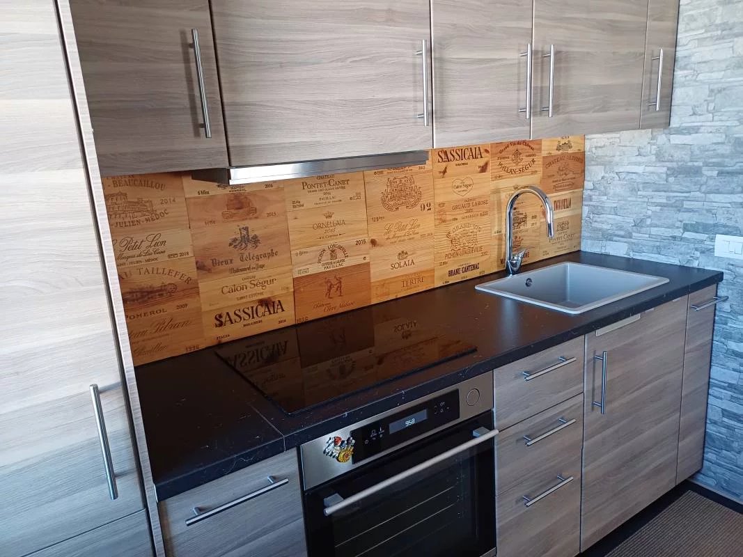 The main area consists of a large living room with an open-plan kitchen. There is a fully functional fireplace which can be used to heat the house in the winter months. In the hallway there is still a stove pipe where a pellet stove used to be.