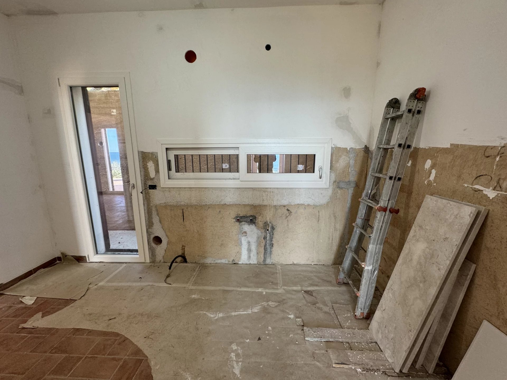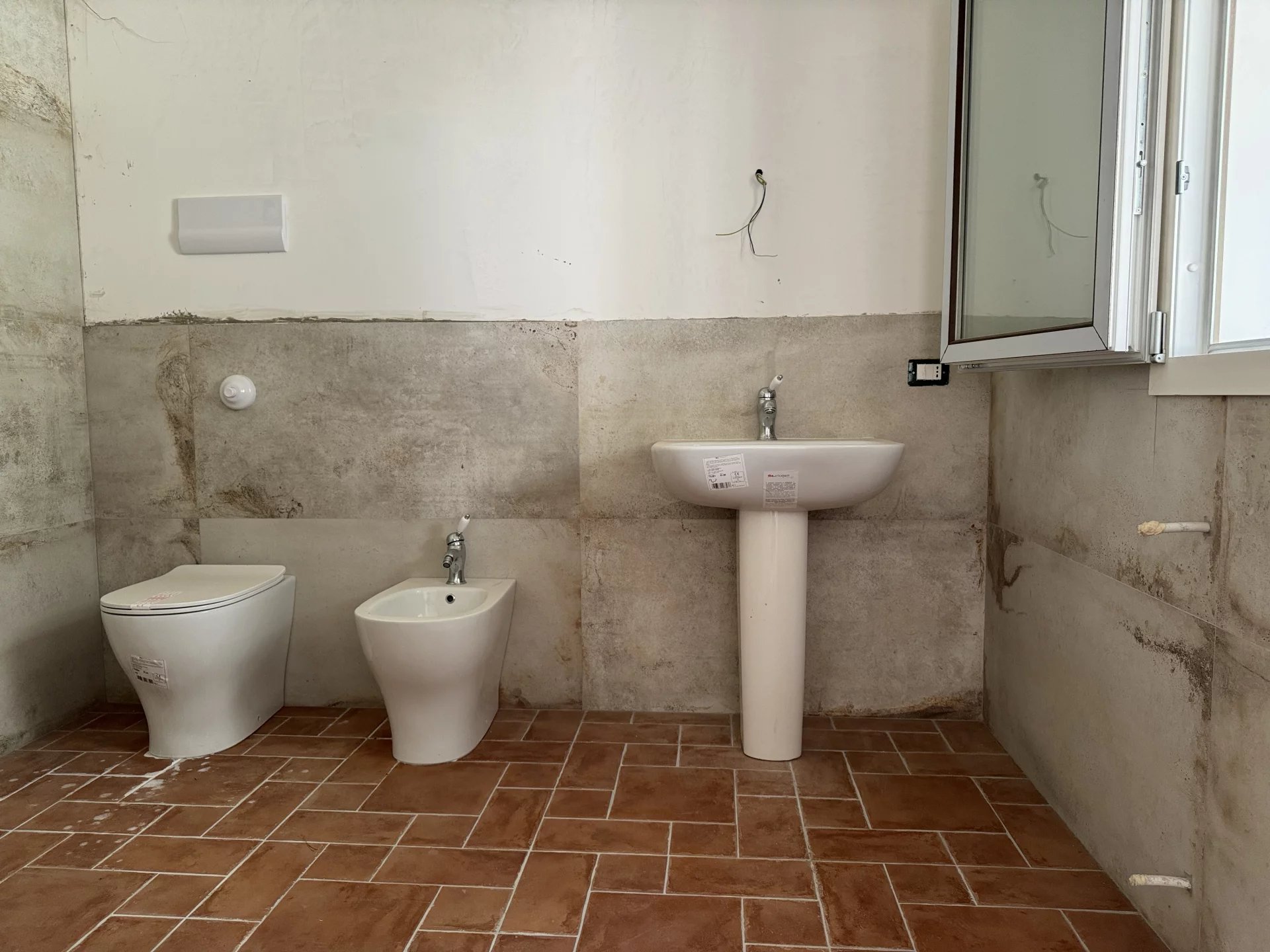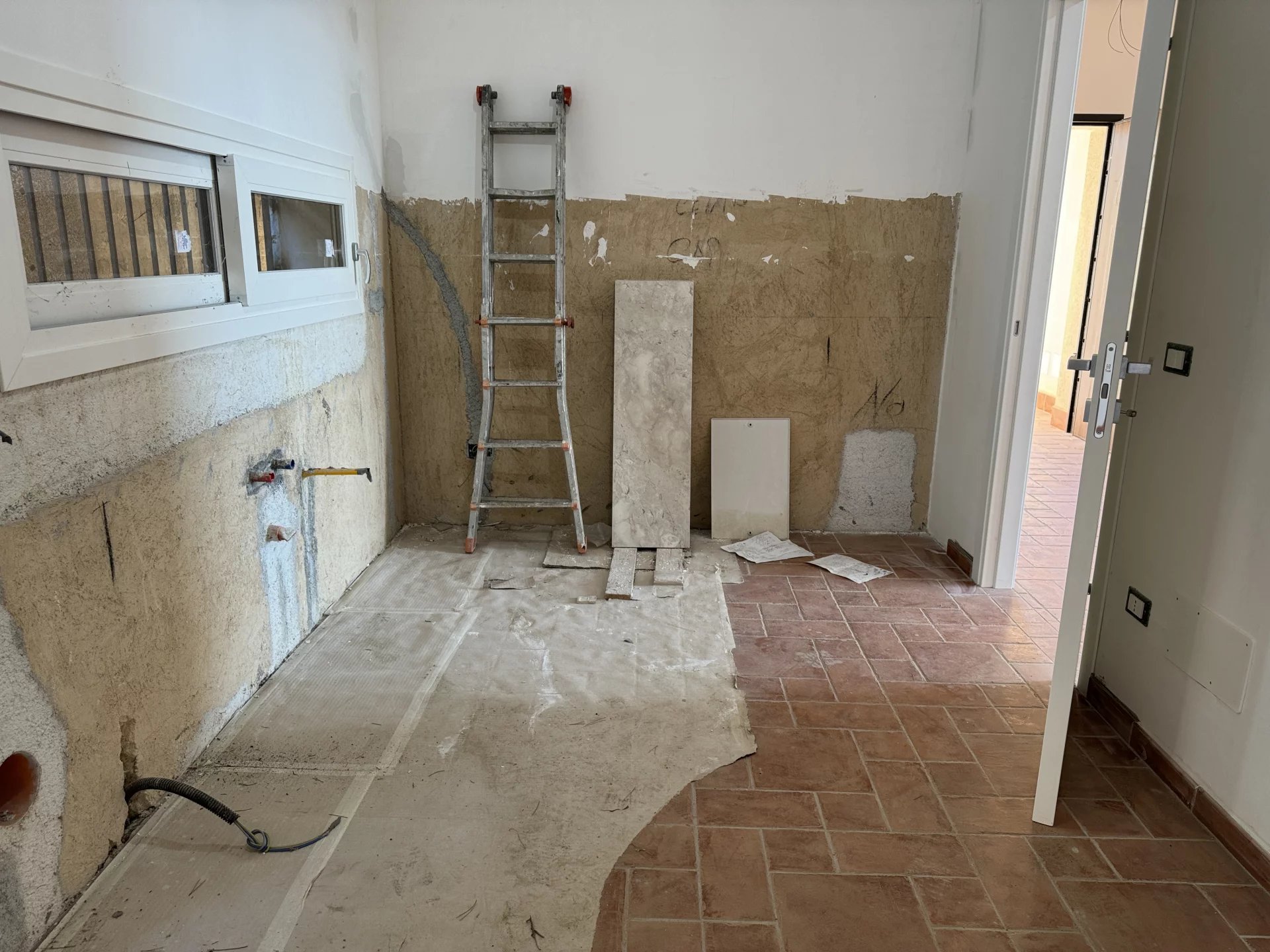 Everything, obviously, is brand new. The windows are double-glazed with thermal insulation and external wooden shutters. The doors are in wood, the floors in local terracotta tile and the finishings, like the beautiful fireplace and the columns of the veranda, in exposed brickwork.